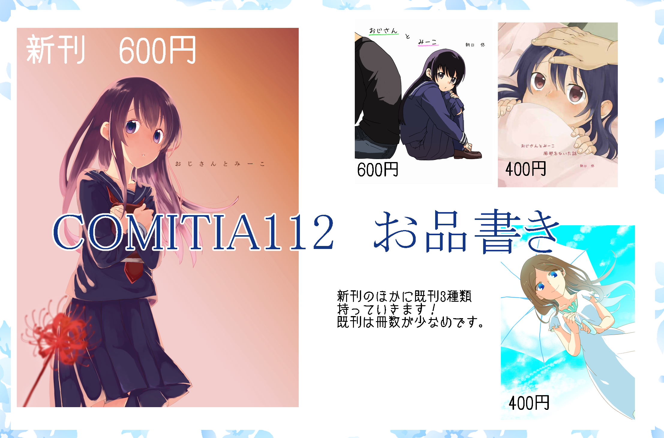 次は8月末にあるコミティアに参加予定です。今回で売り切れてしまった既刊の再録と、できれば新刊1冊かけたらなって、いいなって・・・(小声)